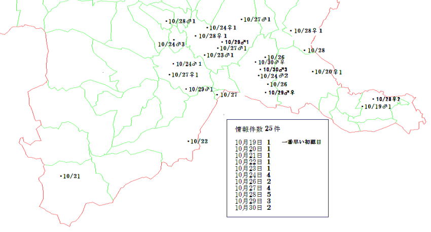 | 10月23日 | ♂ | 1 | 7:20 | 晴 | 前橋市大利根町2丁目 | 吉田喜代美 | 車中より確認 | 会員 |